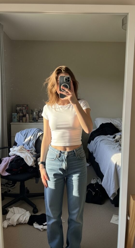1. White Fitted Tee + Light Wash Baggy Jeans 🤍