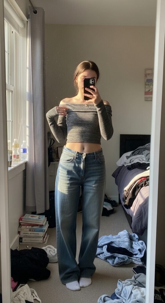 8. Off-Shoulder Top + Baggy Jeans 💫