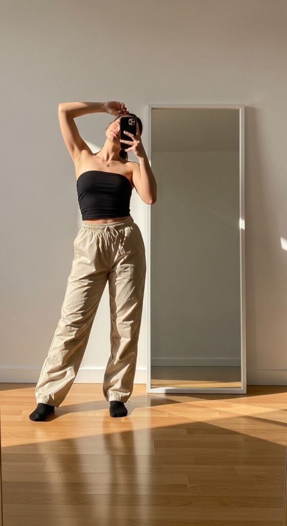 8. Black Tube Top + Parachute Pants 🧢