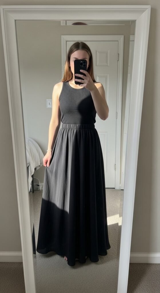 3. Ribbed Tank + Flowing Maxi Skirt 🌬️