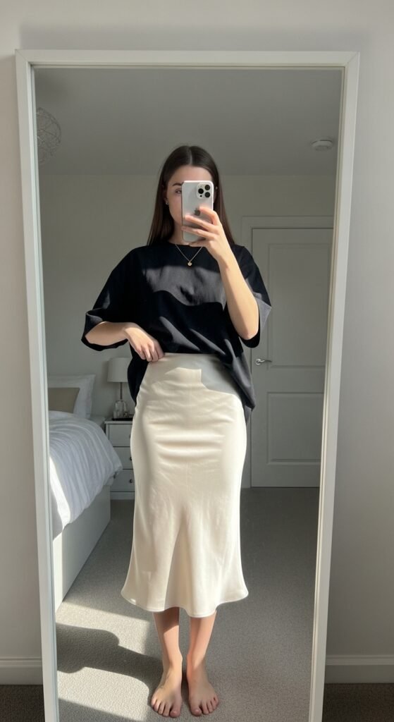 7. Oversized Black Tee + Satin Midi Skirt ✨