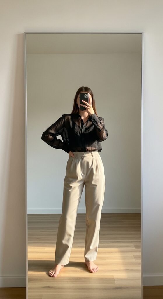 2. Sheer Black Shirt + Bralette + Relaxed Trousers 🌑