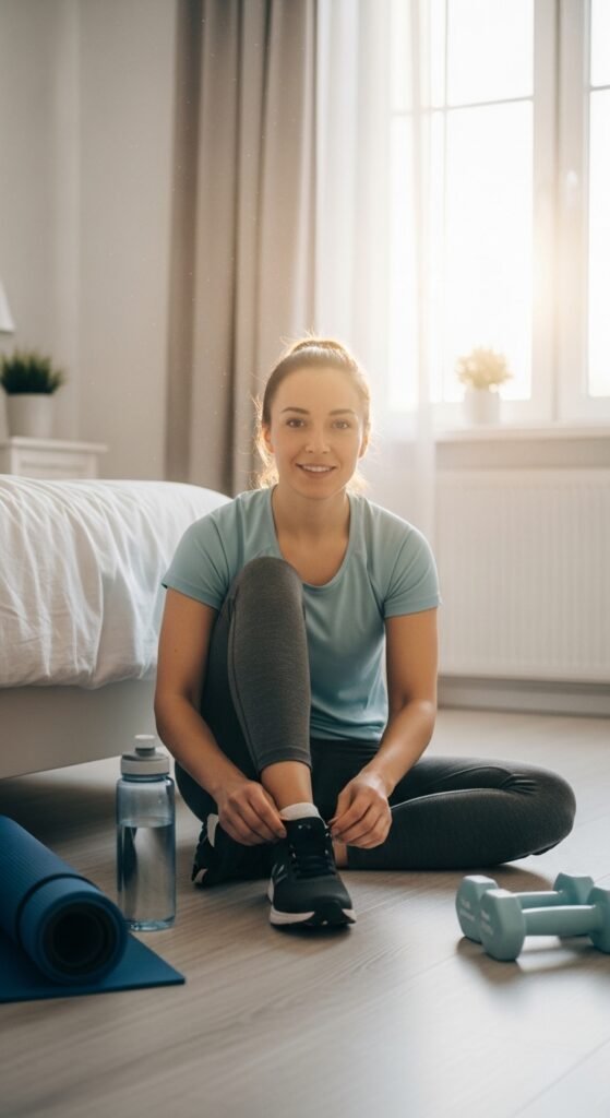 - Simple workouts like walking, squats, push-ups, or beginner yoga